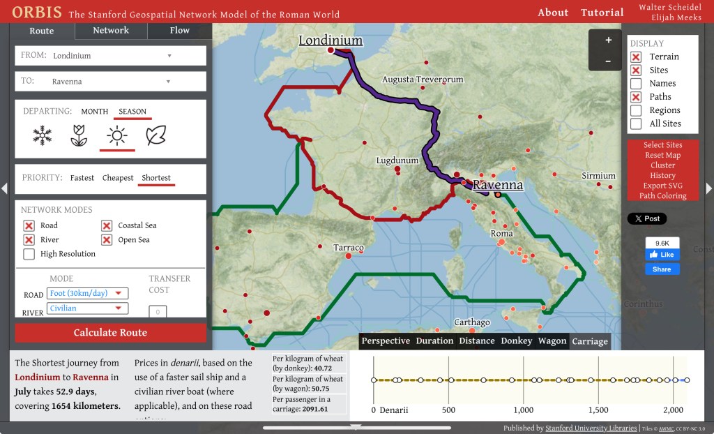 Une carte interactive pour planifier et connaitre la durée de voyages dans l’Empire romain.